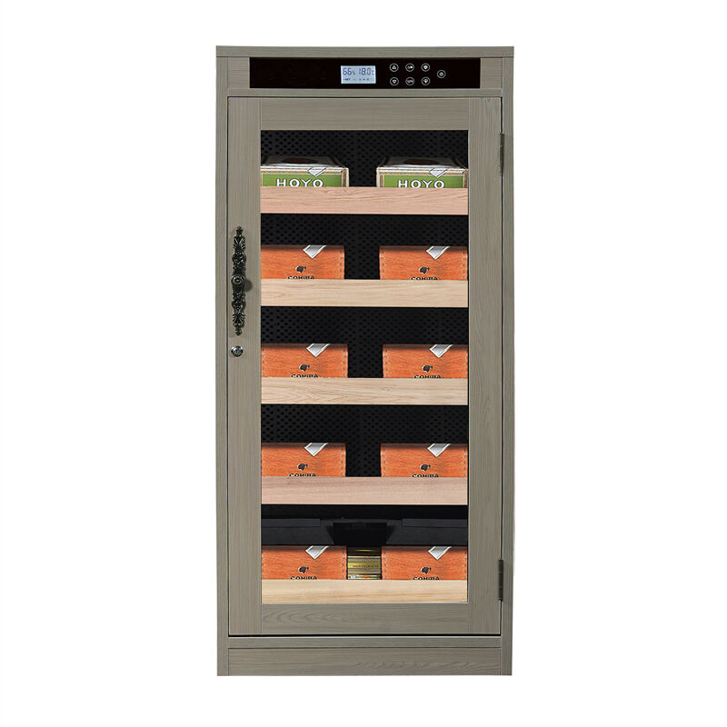 고급스러움과 세련됨을 발산하는 세련된 그레이 우드 마감으로 특징적인 이 시가 쿨러 휴미더 캐비닛은 현대적인 미학과 시대를 초월하는 매력을 결합합니다. 세련된 디자인에는 프리미엄 시가 컬렉션을 우아하게 전시하면서 최적의 보관 조건을 유지하는 투명 유리 문이 포함되어 있습니다. 상단의 우아한 디지털 제어판은 습도 및 온도 수준을 실시간으로 모니터링하여 시가를 위한 정밀한 환경 제어를 보장합니다.